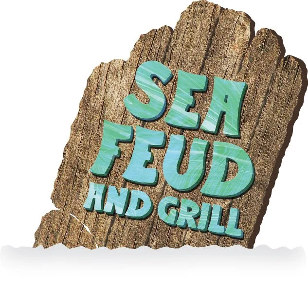 This set of signage is for a sinking pirate ship restaurant that has sharks and pirates currently performing a cook-off so guests can decide whose food is better.
